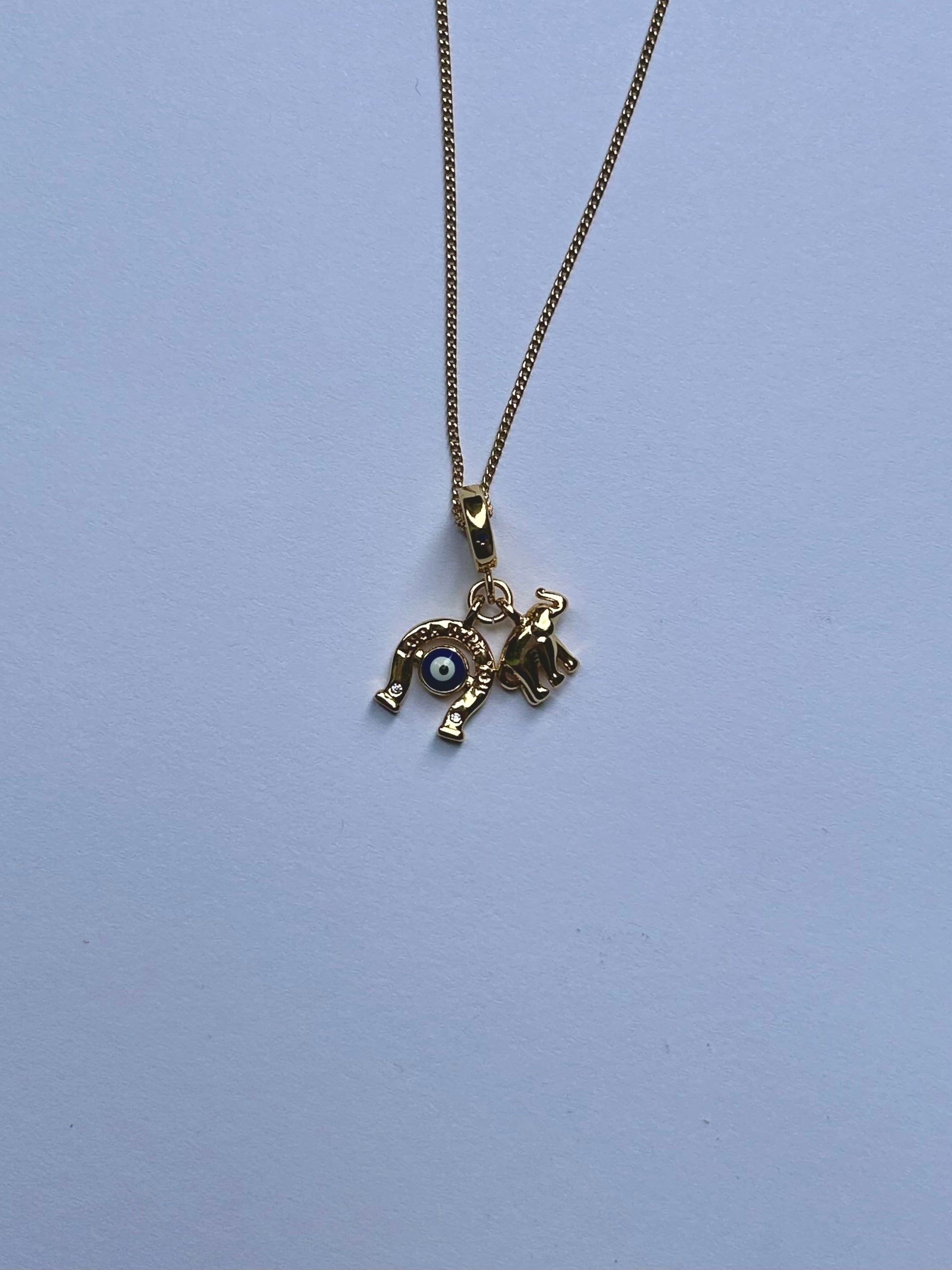 Deja que "Fortunata" te traiga buena suerte y sabiduría con este collar cargado de magia y buena suerte. El dije doble, con una herradura y un elefante chapados en oro, te protegerá y te guiará hacia el éxito. Agrega un toque de magia y sofisticación a tus outfits con este accesorio.