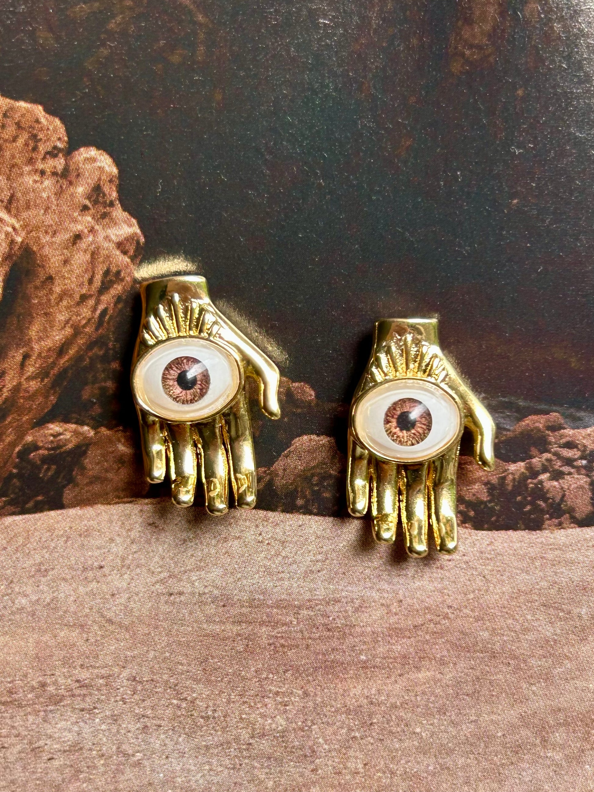 Aretes en forma de manochapados en oro con motivos en forma de ojo hechos de acrílico